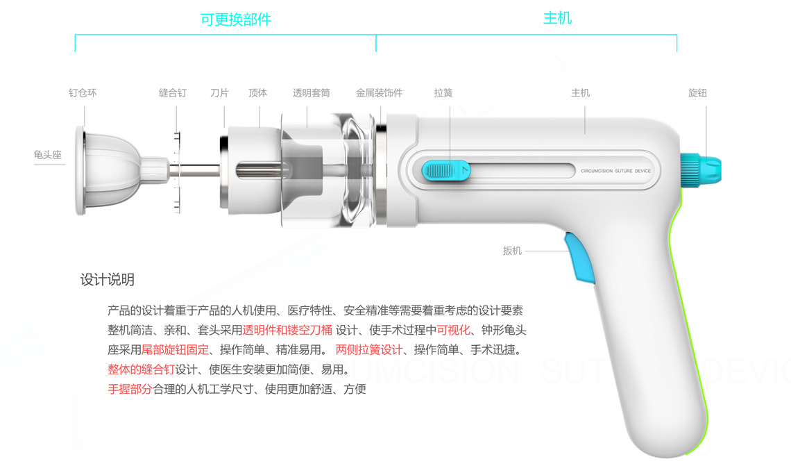 • 項目挑戰:包皮環切縫合器設計著重于產品的人機使用、醫療特性、安全精準等要素。