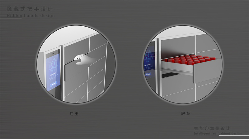 摒棄了傳統(tǒng)外凸把手的設(shè)計(jì),智能印章柜將開啟方式藏于細(xì)節(jié)之中。