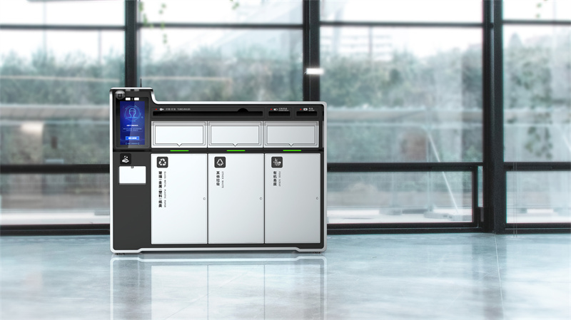 頂部交互區(qū)以優(yōu)雅的弧形向下延伸,與直立的主體形成流暢過渡。中部投放區(qū)通過色彩和圖標(biāo)進行明確的功能分區(qū),不同分類口采用差異化設(shè)計,既確保識別度又保持整體美感。