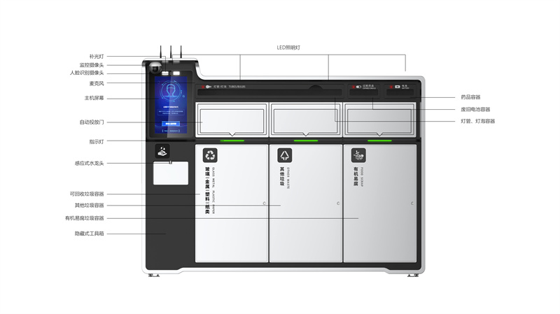 可回收倉自帶壓縮功能,易拉罐進(jìn)去瞬間變鐵餅;有害品倉就像保險(xiǎn)柜,舊電池投進(jìn)去自動落鎖。