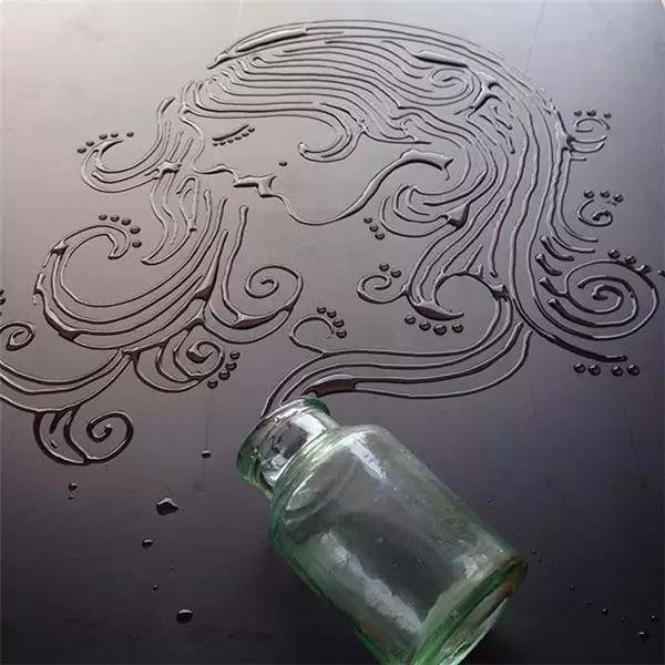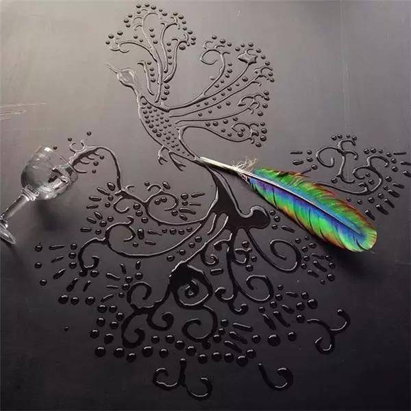 一杯水灑在桌子上,很多人往往就會直接擦掉,但對于一位優秀的設計師來說,它可以變成各種漂亮的作品——幾滴水勾畫出一只美麗的孔雀!